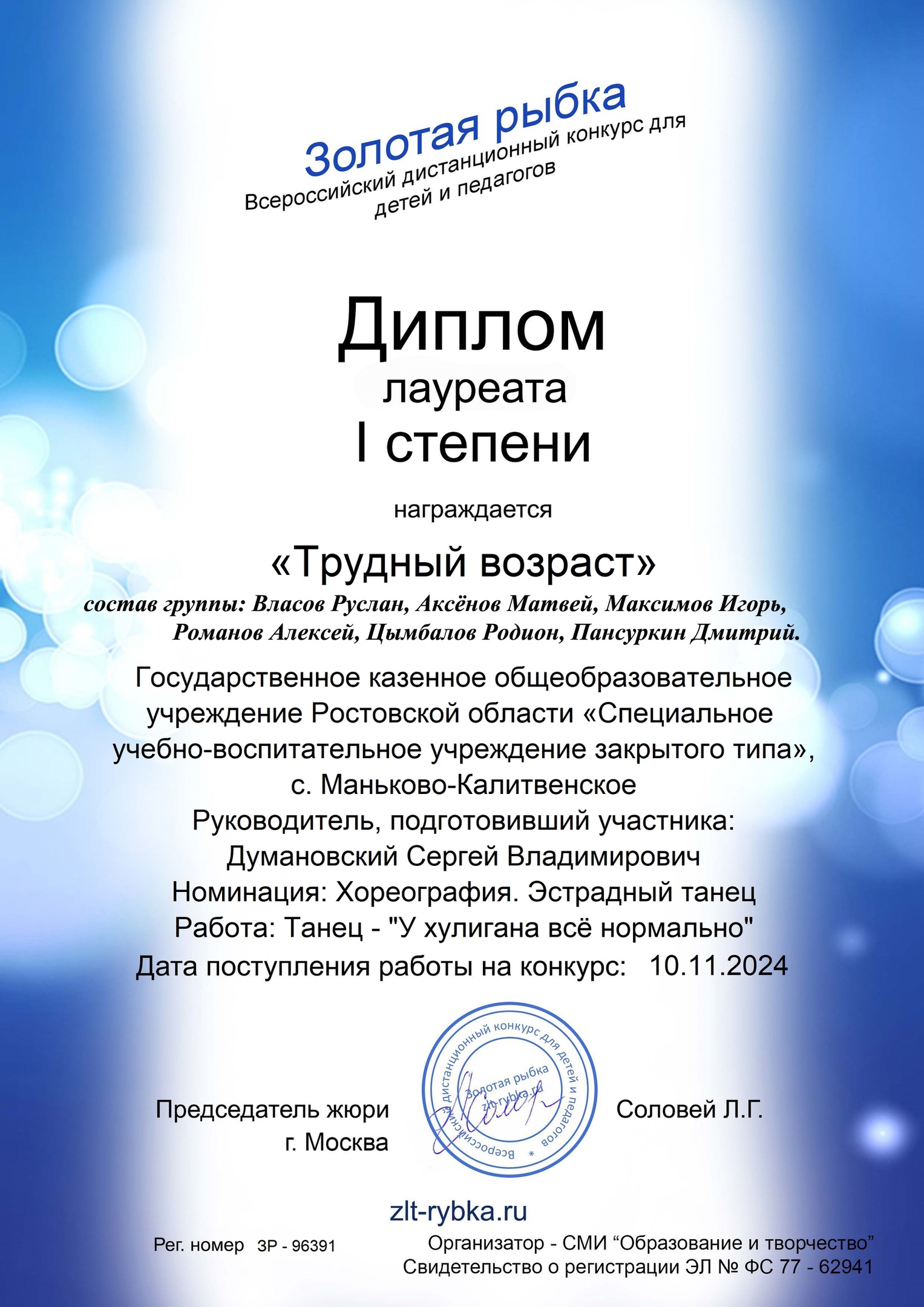 Участие во Всероссийском дистанционном конкурсе для детей и педагогов "Золотая рыбка", в номинации: Хореография. Эстрадный танец. Видеоработа сделана на базе школьного кружка "Видеостудия"