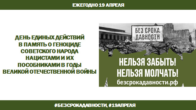 Ежегодно 19 апреля по всей стране проводится День единых действий в память о геноциде советского народа нацистами и их пособниками в годы Великой Отечественной войны. В этот день проводится комплекс памятных мероприятий в школах, вузах, учреждениях науки и культуры, региональных и муниципальных учреждениях, некоммерческих организациях. 81 год назад принят Указ Президиума Верховного Совета СССР № 39 «О мерах наказания для немецко-фашистских злодеев, виновных в убийствах и истязаниях советского гражданского населения и пленных красноармейцев, для шпионов, изменников родины из числа советских граждан и для их пособников».